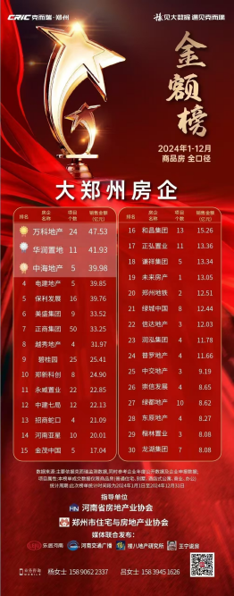 据克而瑞河南区域数据统计,郑州万科荣膺2024年1-12月大郑州房企商品房全口径销售金额榜与面积榜双榜第一。